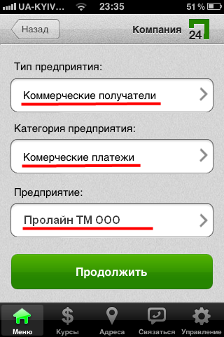 5. В разделе "Тип предприятия" выберите "Коммерческие получатели", в разделе "Категория предприятия" выберите "Комерческие платежи", в разделе "Предприятие" выберите "Пролайн ТМ ТОВ" и нажмите кнопку "Продолжить".